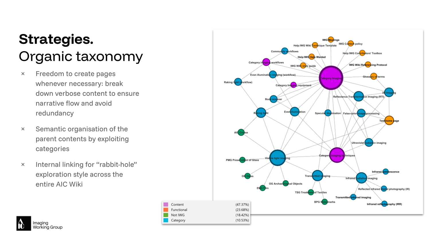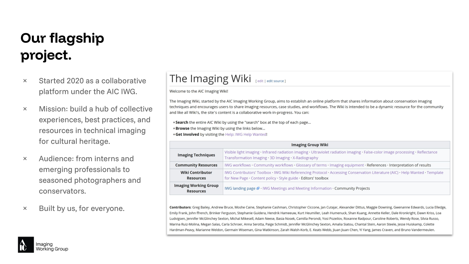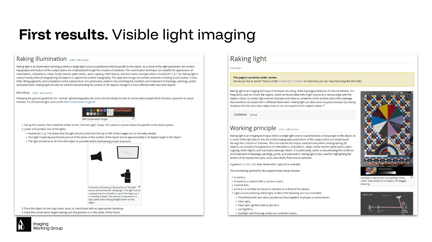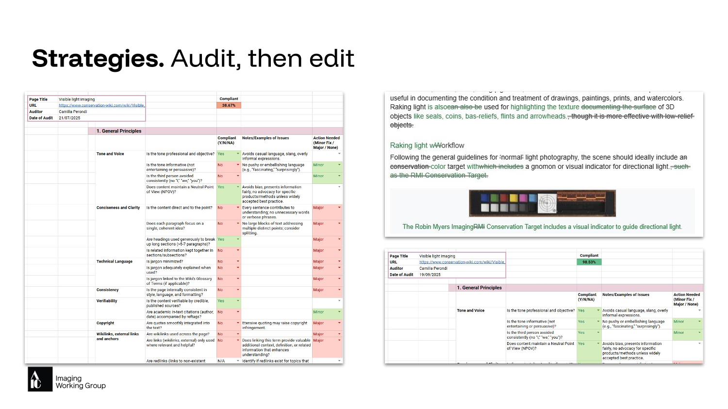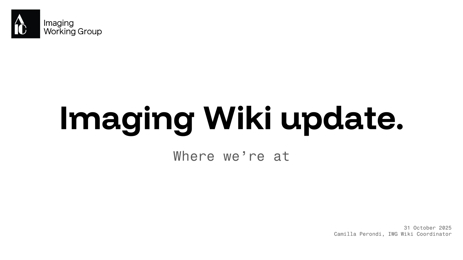 Phase One [pun intended] consisted in creating common rules that apply for everyone across the Imaging Wiki. We didn't start from scratch; we expanded the AIC Wiki Guidelines, built upon the BPG Community Guidelines, and took inspiration from Wikipedia. This mix of sources was intended to retain the values shared among the AIC Wiki specialty groups, as well as to learn from the most established Wiki online. One big leap that we took was to not recognise the authorship of the individual pages because we believe that i) any contribution counts, whether it's a link to a conference recording or seven paragraphs on colour management; and ii) the Imaging Wiki is not a scholarly publication, but a resource open to everyone. The list of all contributors, old and new alike, remains visible in the Imaging WIki home page.